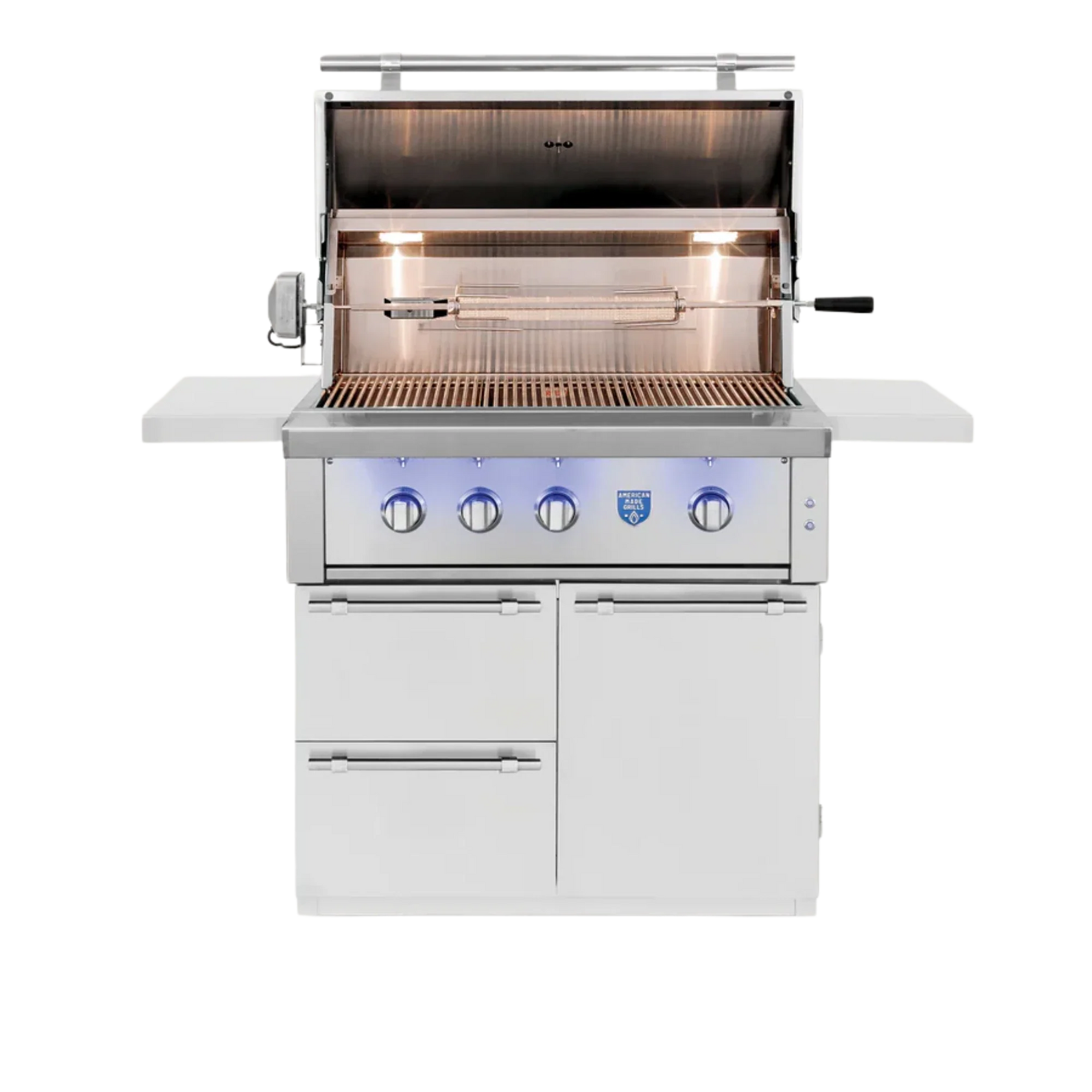 Create the ultimate mobile outdoor kitchen with the American Made Grills Estate 36-Inch Built-In Gas Grill and the matching 36-Inch Estate Grill Cart. This powerful duo brings together professional-grade performance and unparalleled mobility, allowing you to take your grilling game wherever the party is. Built with pride in the USA from premium #304 stainless steel, this bundle offers the perfect blend of power, style, and convenience, designed for grillers who demand the best.