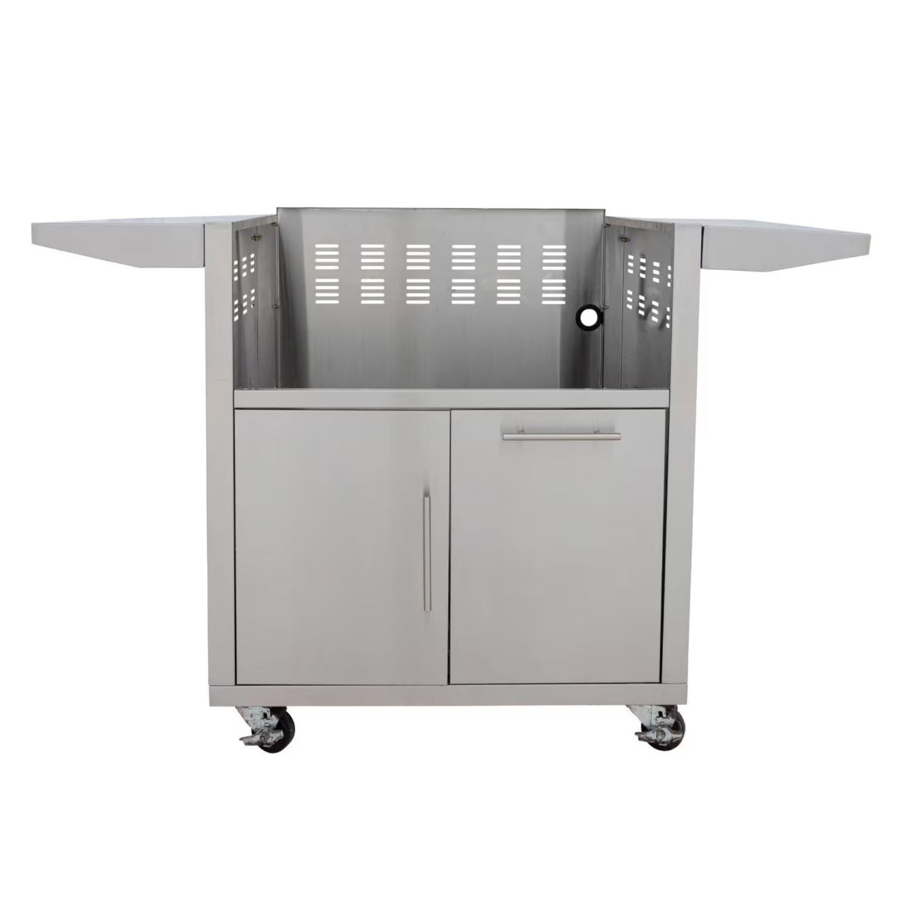 Designed for easy access and organization, it features a soft-close door, a roll-out propane tank holder for effortless fuel changes, and fixed side shelves for extra workspace. Heavy-duty casters make moving the cart around your patio smooth and simple, allowing you to cook wherever the party takes you.