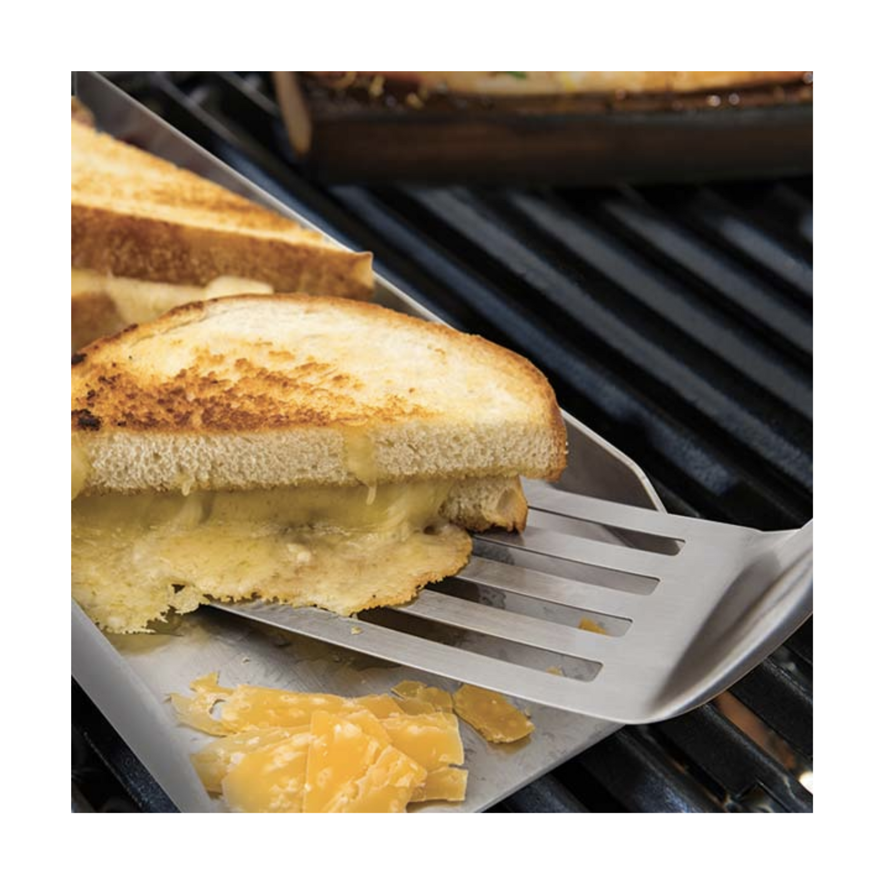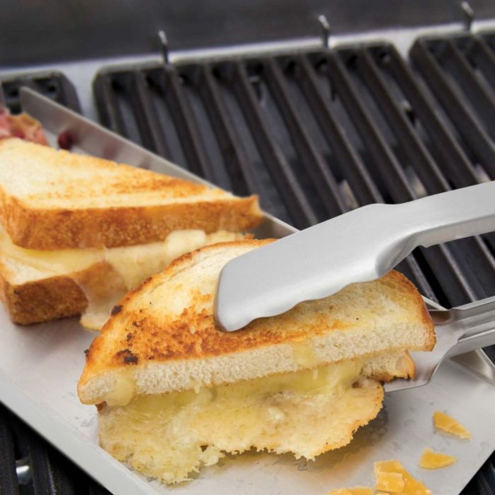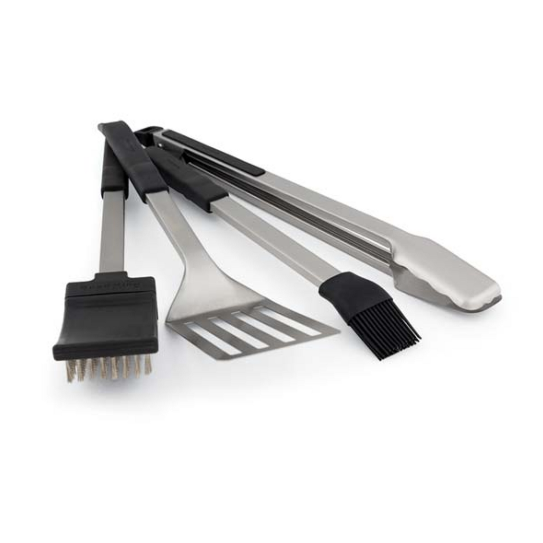 The Baron™ series tool set contains a turner, locking tong, basting brush and grill brush. Hard plastic resin handles and stainless blades make up the core components. The grill brush features an integrated grime guard, while the remainder of the tools have a box design to improve rigidity.