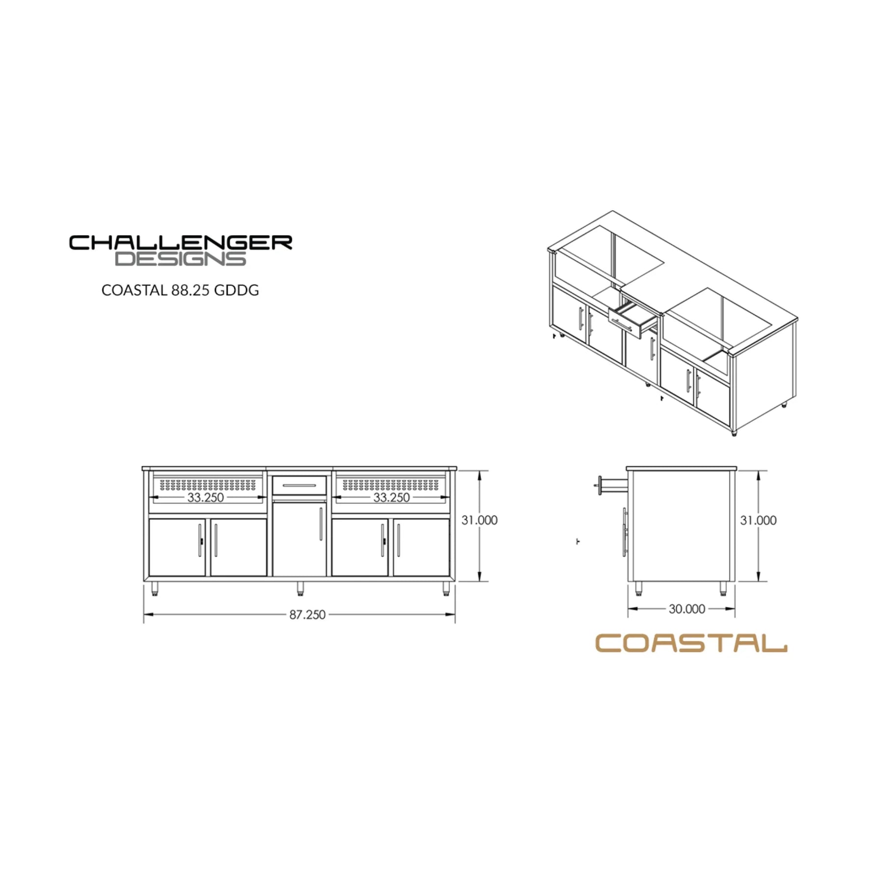Elevate your outdoor cooking space with the Challenge Designs Coastal 88.25" GDDG Kitchen Island, purpose-built to house two 36-inch gas grills. Crafted from powder-coated aluminum and 304 stainless steel, this outdoor island delivers unmatched durability, sleek design, and smart functionality. With a thoughtfully organized layout and weather-resistant construction, it’s the ultimate solution for serious grillers looking to build a professional-grade setup right in their backyard.