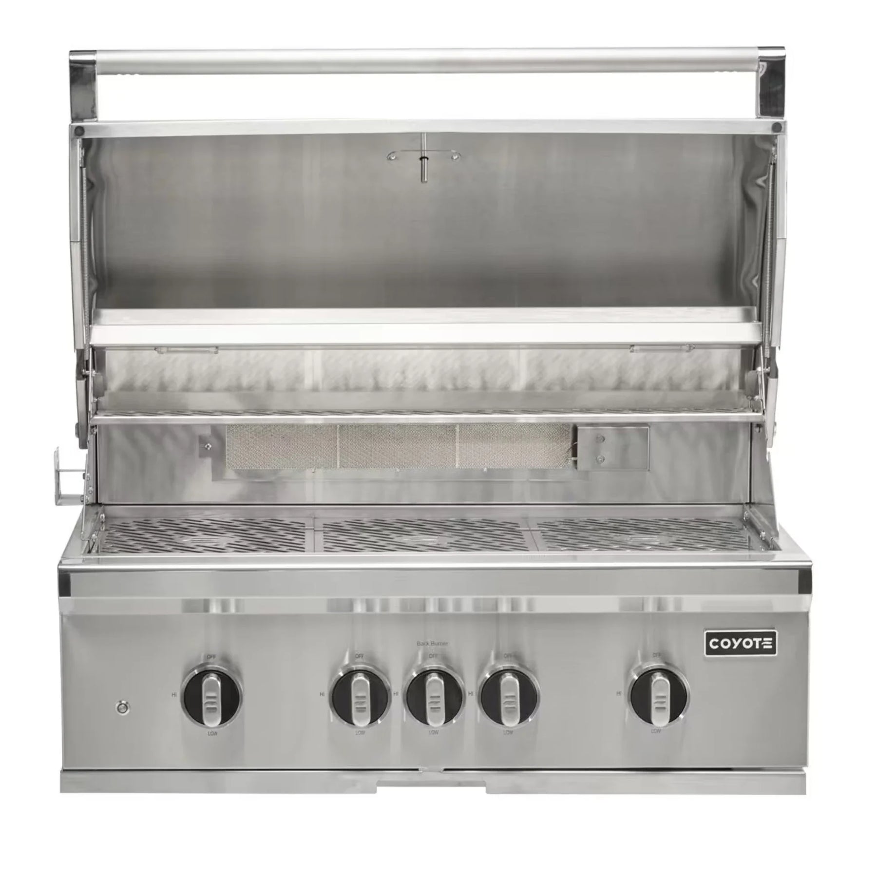 Modern style meets high-end performance in the Coyote SL-Series 36-Inch 4-Burner Built-in Gas Grill—a luxury outdoor cooking solution designed for grillers who want both power and peace of mind. With premium 304 stainless steel construction and a suite of thoughtful features like a spring-assisted hood, LED-lit knobs, and a signature Coyote logo throw light, this grill elevates both your grilling game and your outdoor space. Four Infinity burners powered by volcanic briquettes ensure even heat distribution across laser-cut grates, while the rear burner, interchangeable sear burner, and rotisserie kit add unmatched cooking versatility.