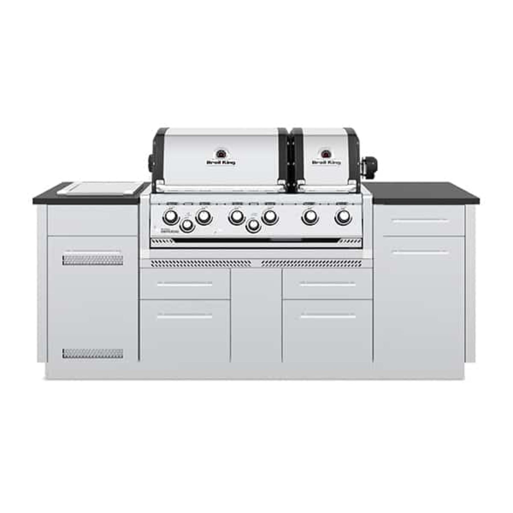 The Broil King® Imperial™ S 690i features two totally independent ovens with a total of 750 sq. in. of primary cooking surface and includes 6 stainless steel Dual-Tube™ burners, built-in oven lights, illuminated control knobs, 6 professional cast stainless steel cooking grids, stainless steel warming rack, stainless steel Flav-R-Wave™ cooking system, and electronic ignition. The S 690i features 304 stainless steel utility cabinet drawers with tank holder (LP) and granite counter top.