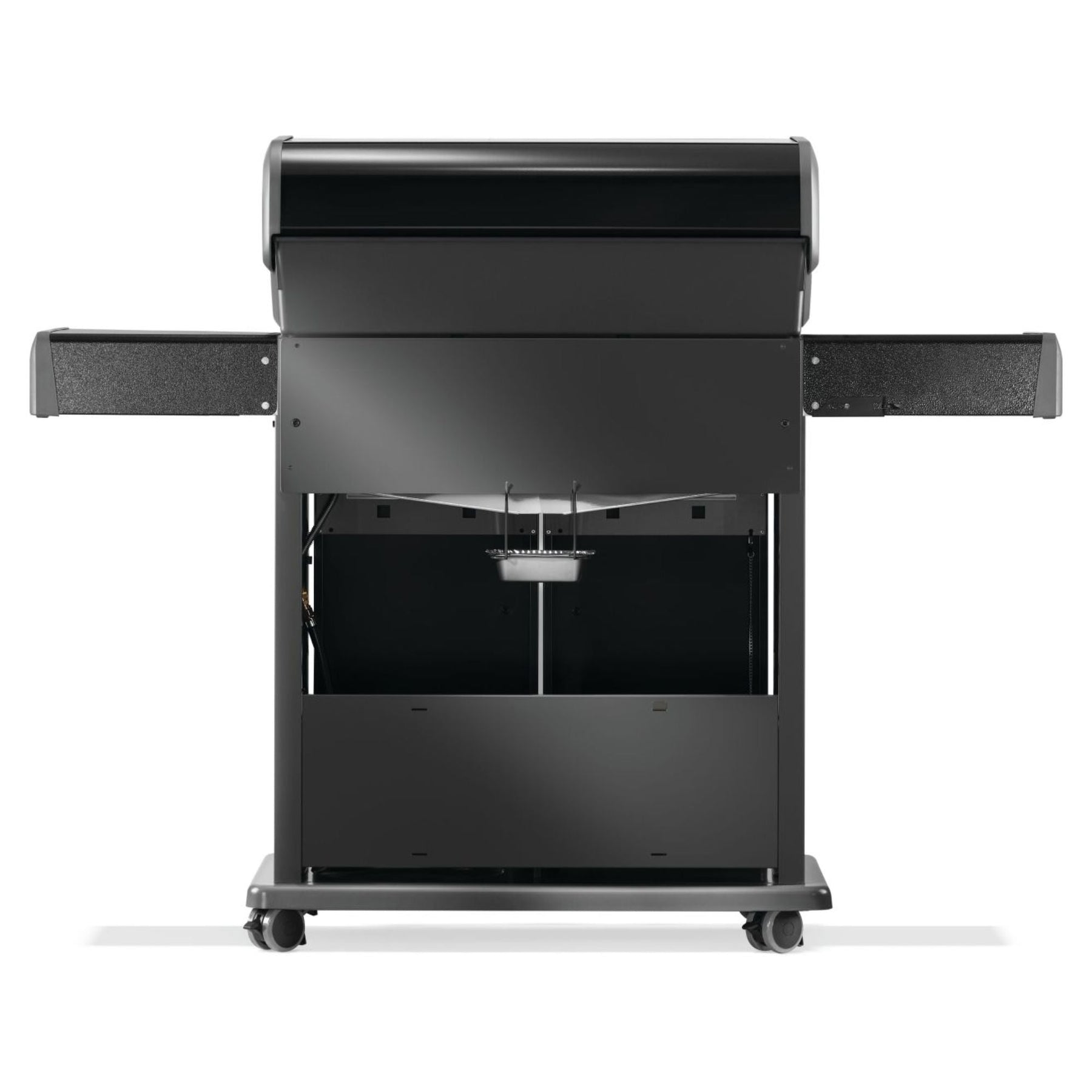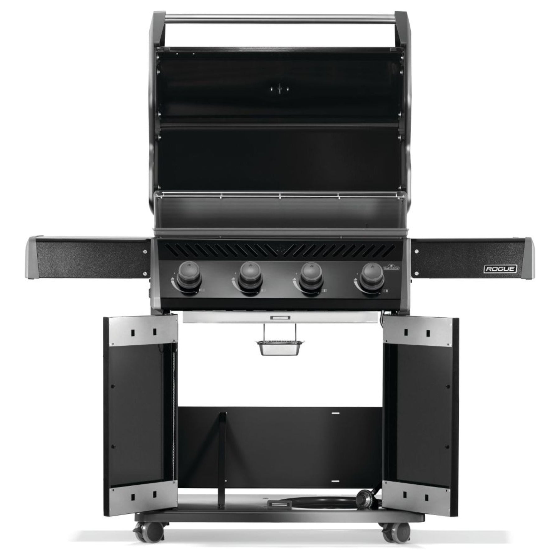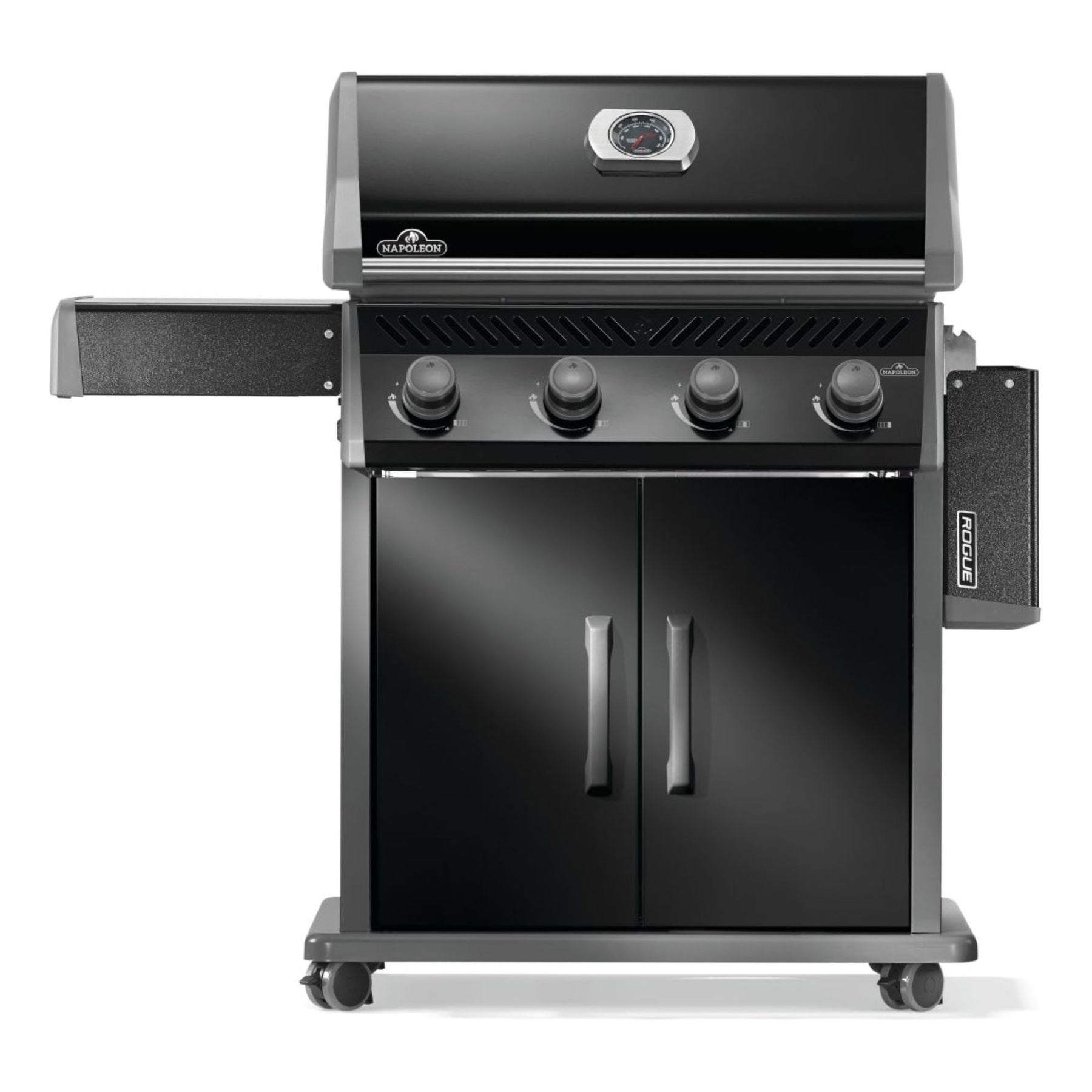 The durable black porcelain enamel lid and powder-coated body ensure long-lasting quality while resisting fingerprints and weathering. Folding stainless steel side shelves make storage simple, and locking caster wheels allow for effortless maneuverability. Whether you're a seasoned grill master or just starting out, the Napoleon Rogue® 525 delivers exceptional performance, space-saving design, and premium features—all at an affordable price.
