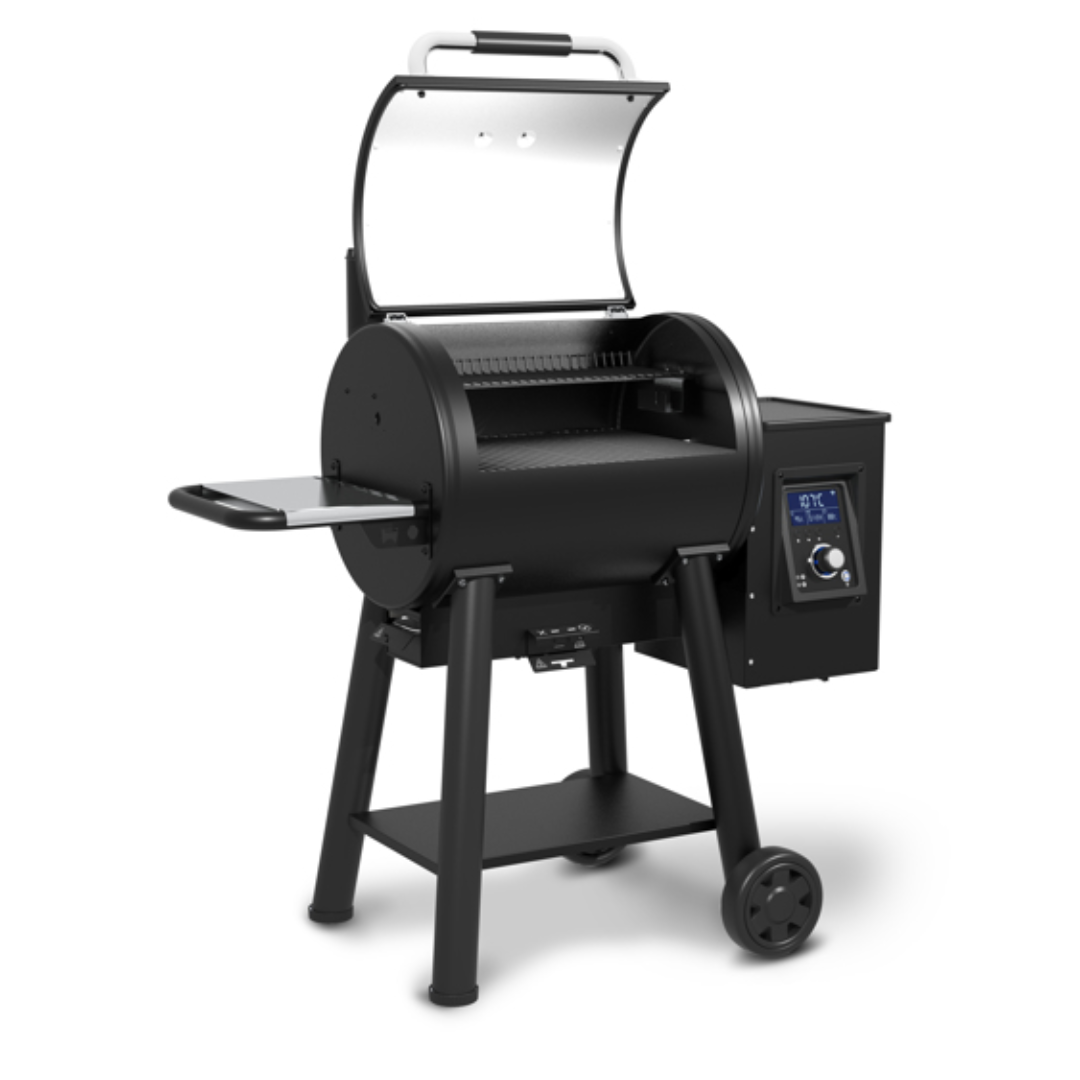 The Regal Pellet 400 pellet grill body is constructed from 2mm (14 gauge) steel, has 500 Sq.in. (3,226 Sq.cm.) of primary cooking surface, 130 Sq.in. (839 Sq.cm.) secondary cooking surface and heavy duty cast iron cooking grids. That’s 225 lbs. of grill right out of the box. The Wifi and Bluetooth® enabled digital controller provides enhanced temperature control to smoke, roast or sear. The controller display panel is the easiest to read while grilling, check the competition. This innovative product comes fully equipped with a powerful auger, 22-lb capacity pellet hopper, removable grease management system, unique ash management system, deluxe rotisserie kit, 2 electronic meat probes, and base storage and side shelf.