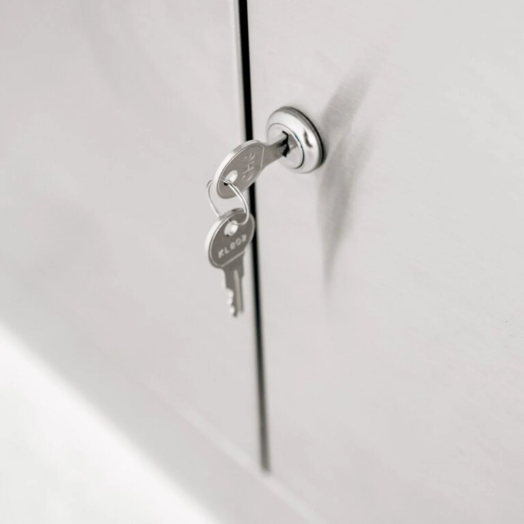 Locking magnetic latch double access doors allow safe and convenient propane tank storage and tool access